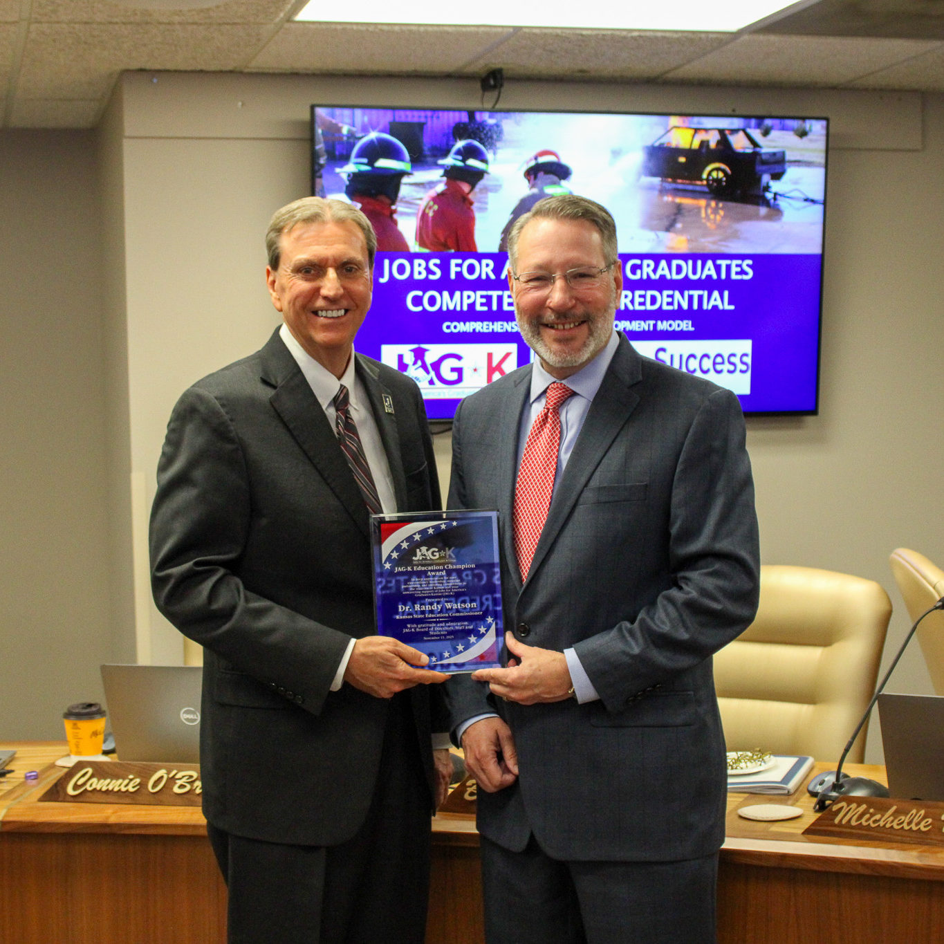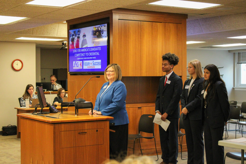 Last week, Jobs for America’s Graduates- Kansas (JAG-K) presented to the Kansas State Board of Education, a long-time supporter and advocate for the work that JAG-K does.  This was an exciting opportunity for JAG-K to share news of their new micro-credentialing pilot, student success stories, and recognize retiring State Education Commissioner Dr. Randy Watson’s contributions to education.